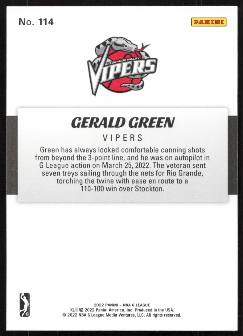 This Basketball card, from 2022 is part of the Panini NBA G League card set. Gerald Green is featured and has a card number of 114.