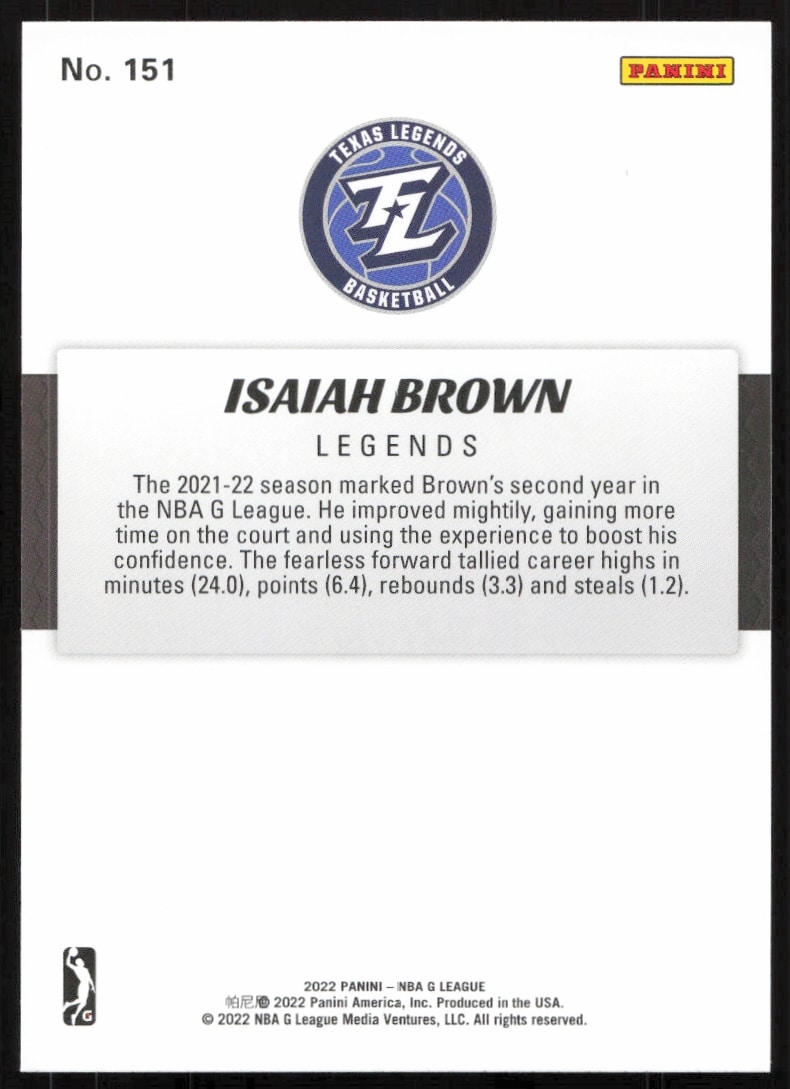 This Basketball card, from 2022 is part of the Panini NBA G League card set. Isiah Brown is featured and has a card number of 151.
