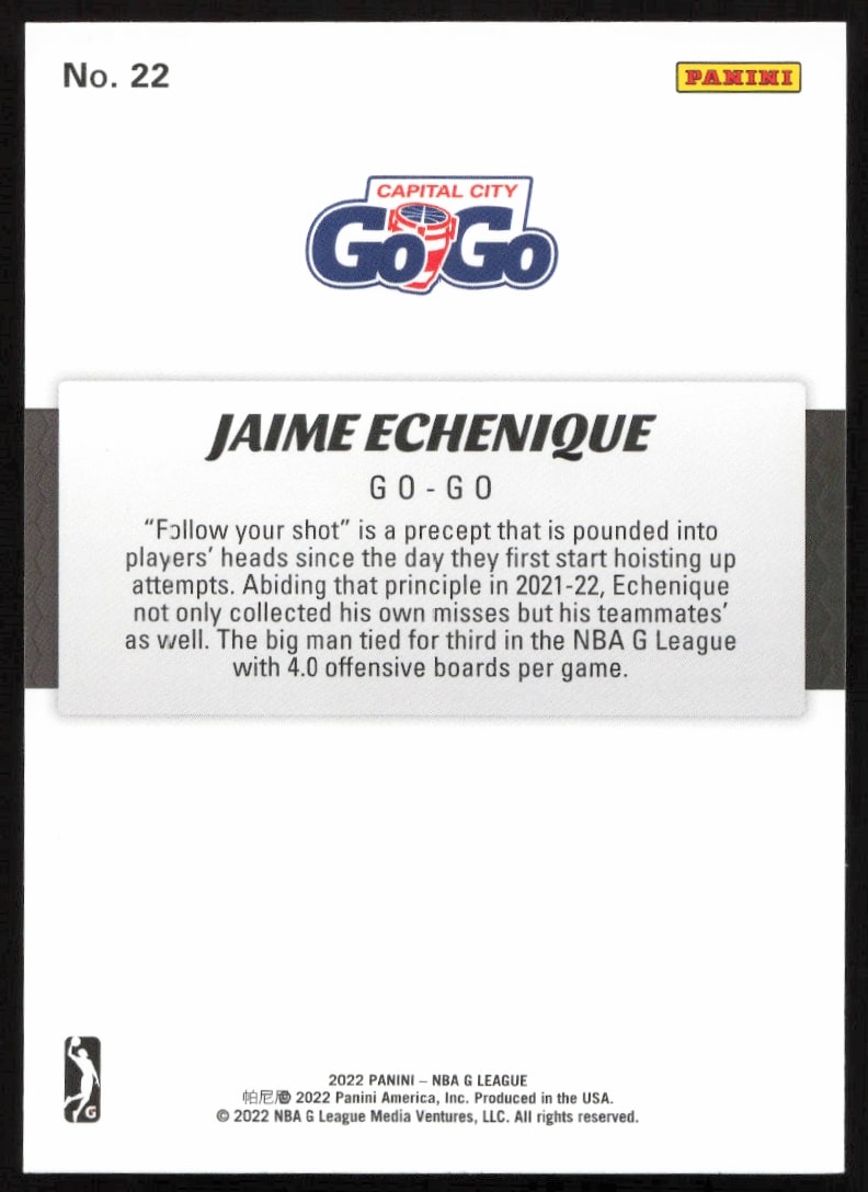 This Basketball card, from 2022 is part of the Panini NBA G League card set. Jaime Echenique is featured and has a card number of 22.