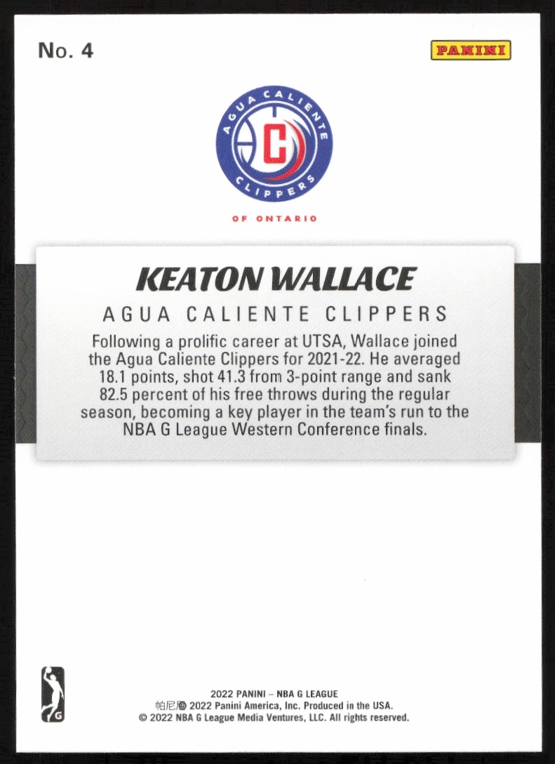 This Basketball card, from 2022 is part of the Panini NBA G League card set. Keaton Wallace is featured and has a card number of 4.