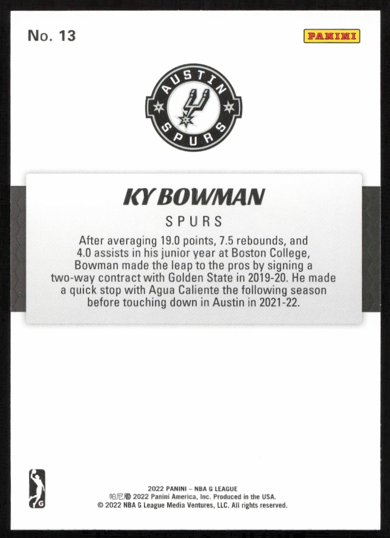 This Basketball card, from 2022 is part of the Panini NBA G League card set. Ky Bowman is featured and has a card number of 13.