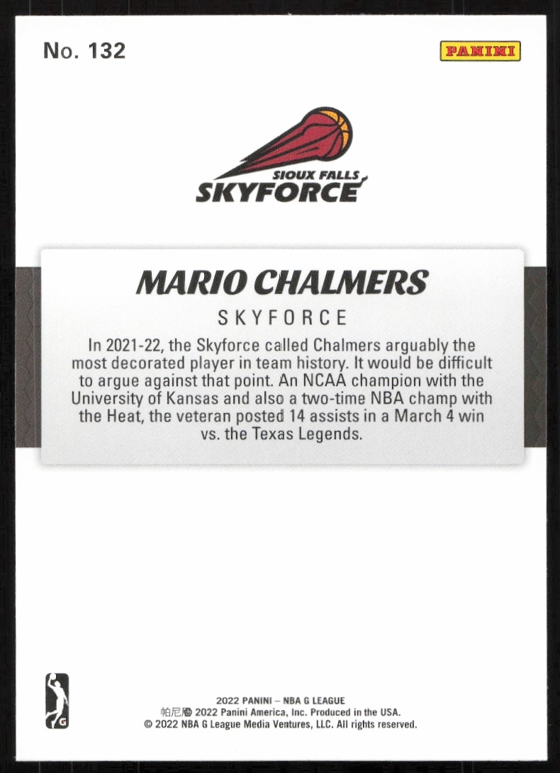 This Basketball card, from 2022 is part of the Panini NBA G League card set. Mario Chalmers is featured and has a card number of 132.