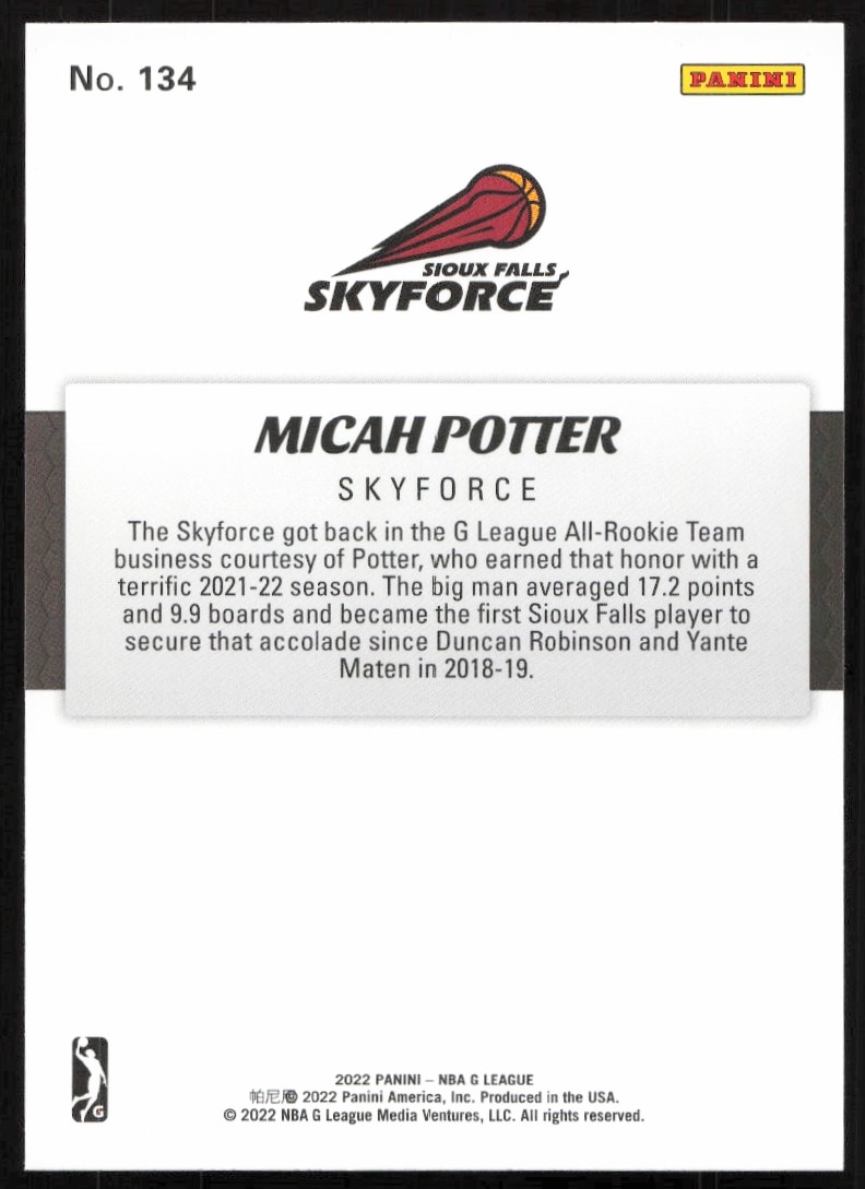 This Basketball card, from 2022 is part of the Panini NBA G League card set. Micah Potter is featured and has a card number of 134.