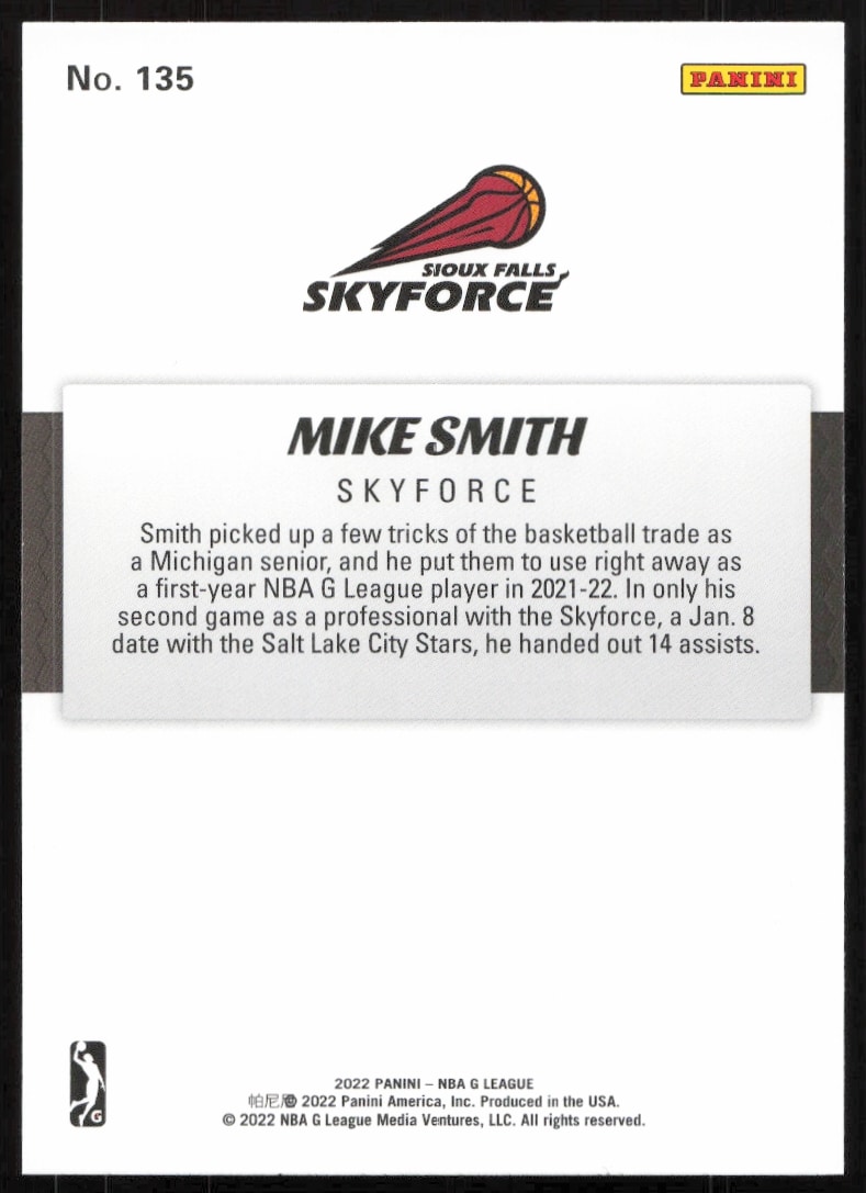 This Basketball card, from 2022 is part of the Panini NBA G League card set. Mike Smith is featured and has a card number of 135.