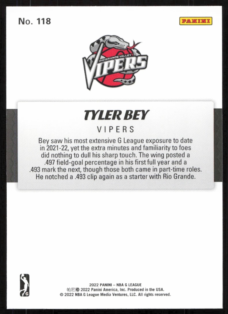 This Basketball card, from 2022 is part of the Panini NBA G League card set. Tyler Bey is featured and has a card number of 118.