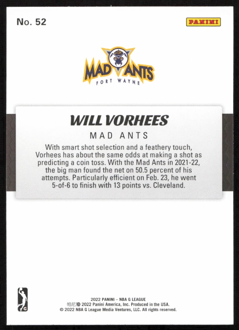 This Basketball card, from 2022 is part of the Panini NBA G League card set. Will Vorhees is featured and has a card number of 52.