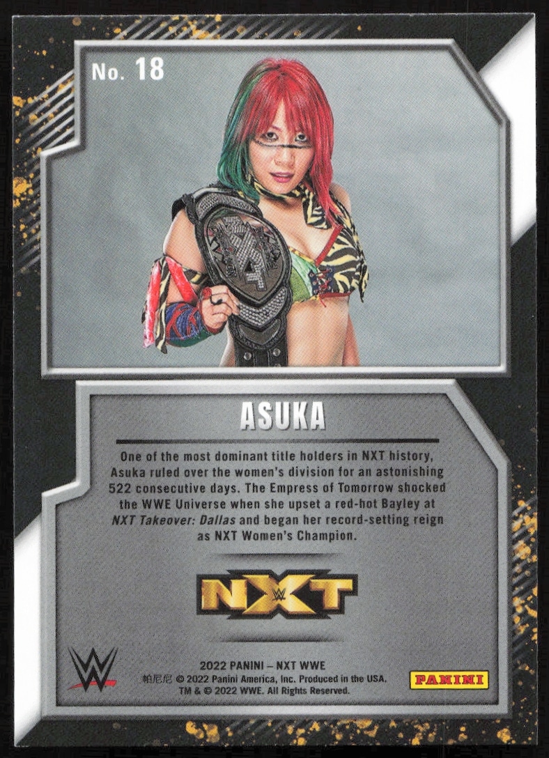 This Wrestling card, from 2022 is part of the Panini NXT 2.0 WWE card set. Asuka is featured and has a card number of 18.