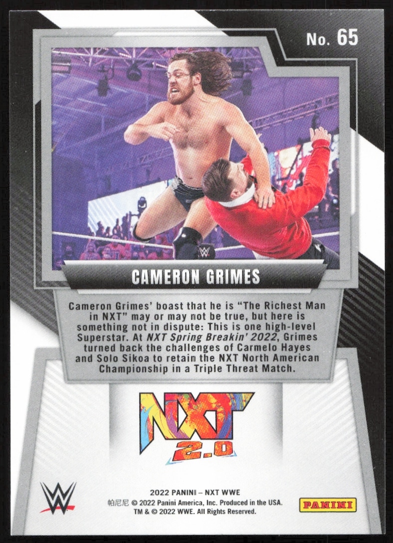 This Wrestling card, from 2022 is part of the Panini NXT 2.0 WWE card set. Cameron Grimes is featured and has a card number of 65.