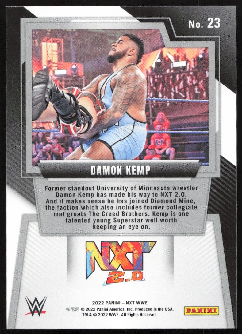 This Wrestling card, from 2022 is part of the Panini NXT 2.0 WWE card set. Damon Kemp is featured and has a card number of 23.