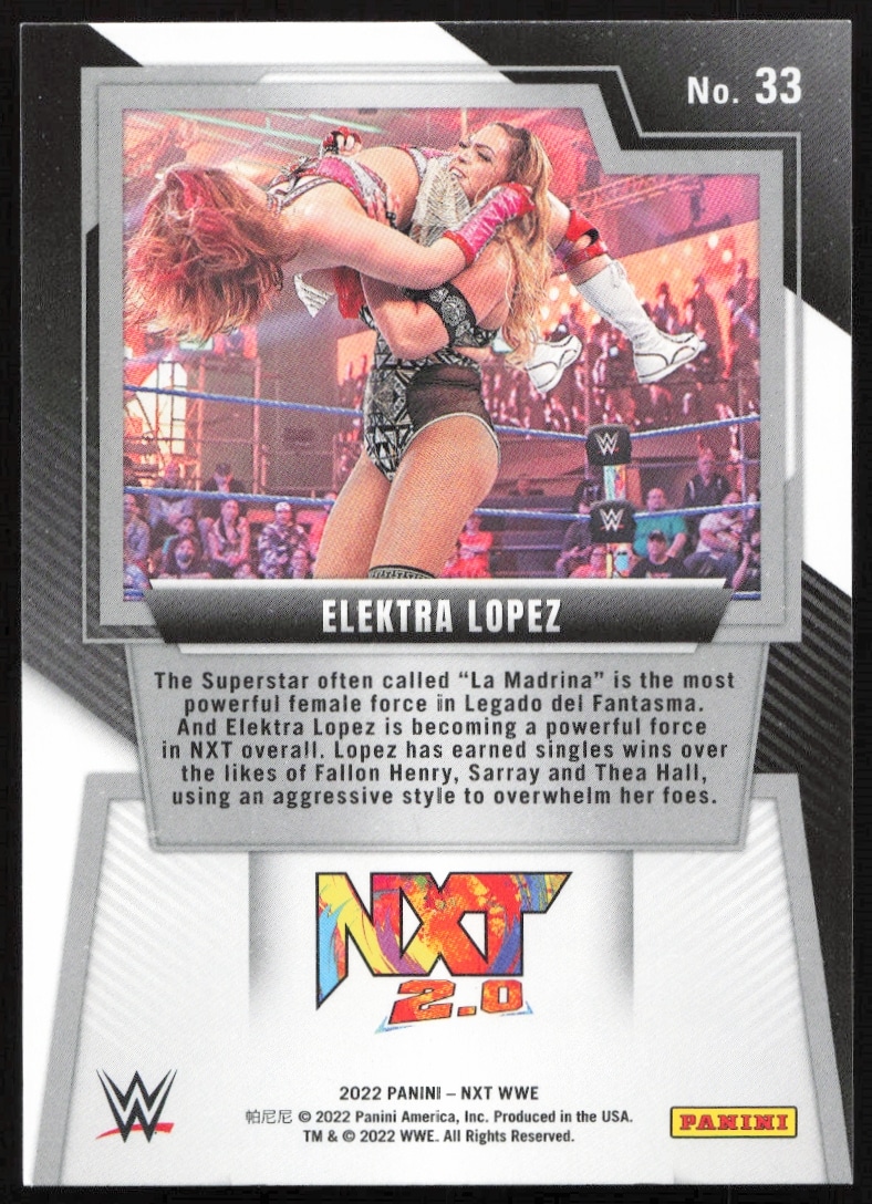 This Wrestling card, from 2022 is part of the Panini NXT 2.0 WWE card set. Elektra Lopez is featured and has a card number of 33.