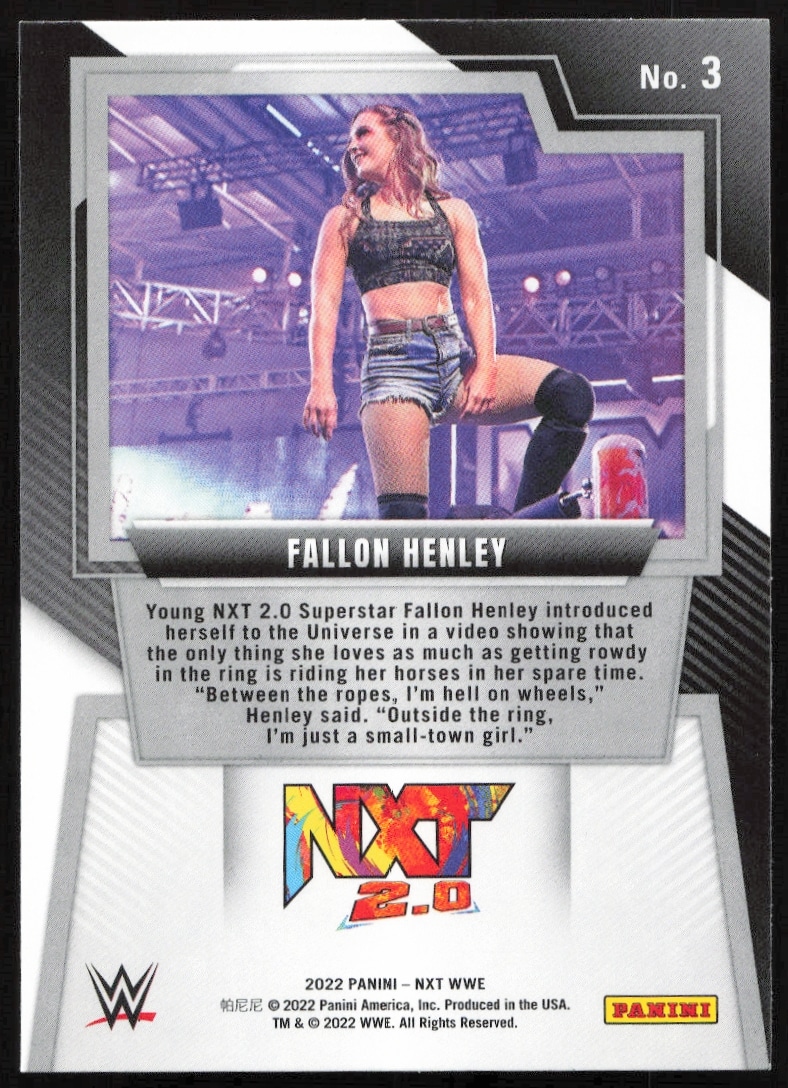 This Wrestling card, from 2022 is part of the Panini NXT 2.0 WWE card set. Fallon Henley is featured and has a card number of 3.