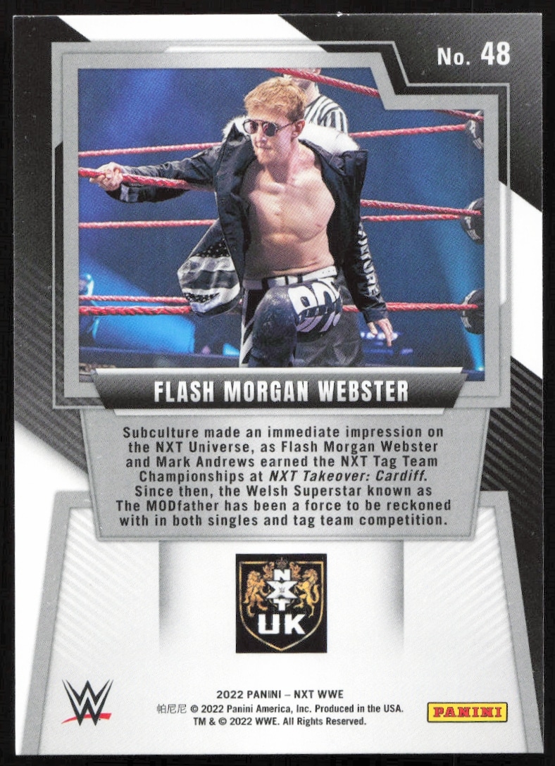 This Wrestling card, from 2022 is part of the Panini NXT 2.0 WWE card set. Flash Morgan Webster is featured and has a card number of 48.