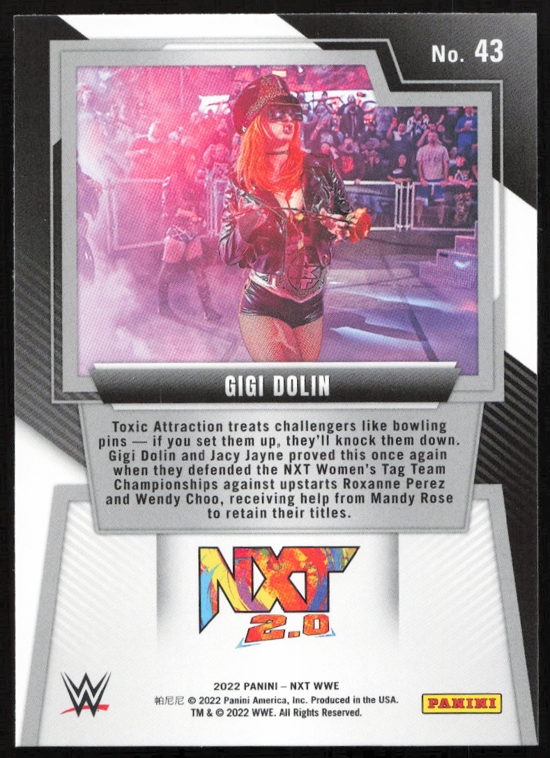 This Wrestling card, from 2022 is part of the Panini NXT 2.0 WWE card set. Gigi Dolin is featured and has a card number of 43.