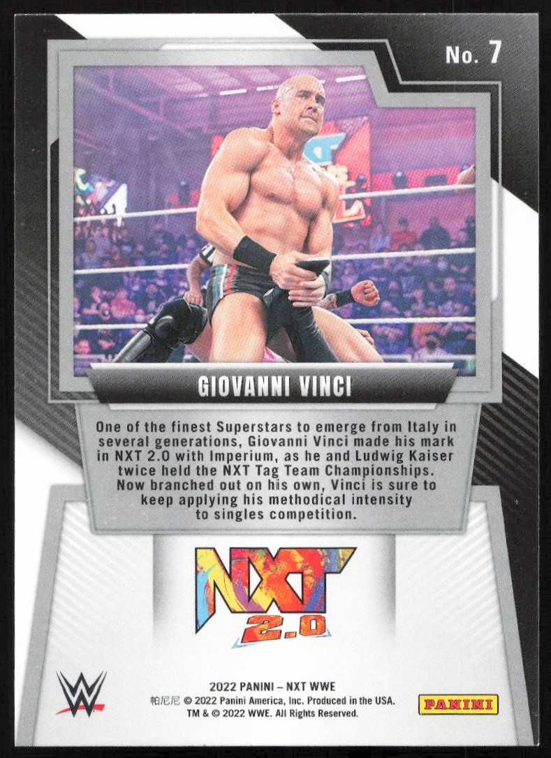 This Wrestling card, from 2022 is part of the Panini NXT 2.0 WWE card set. Giovanni Vinci is featured and has a card number of 7.