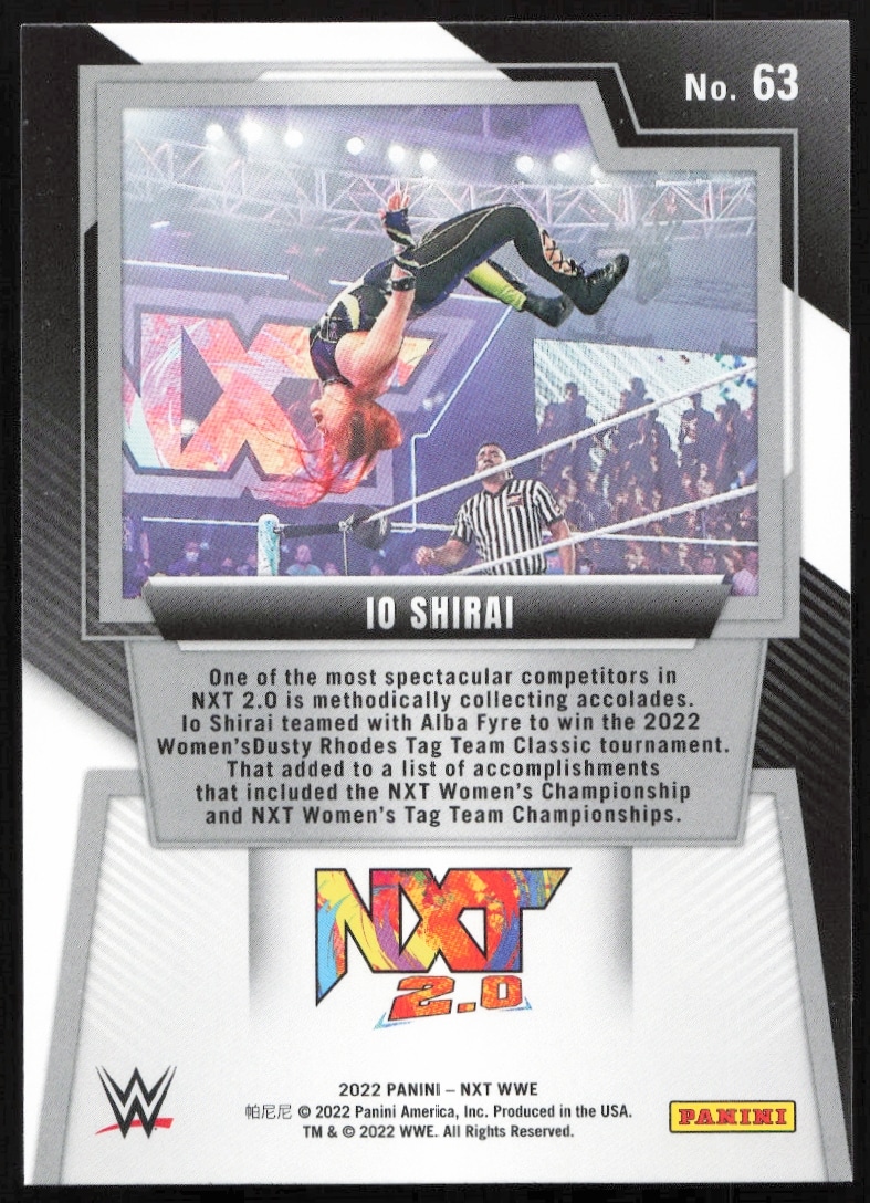 This Wrestling card, from 2022 is part of the Panini NXT 2.0 WWE card set. Io Shirai is featured and has a card number of 63.