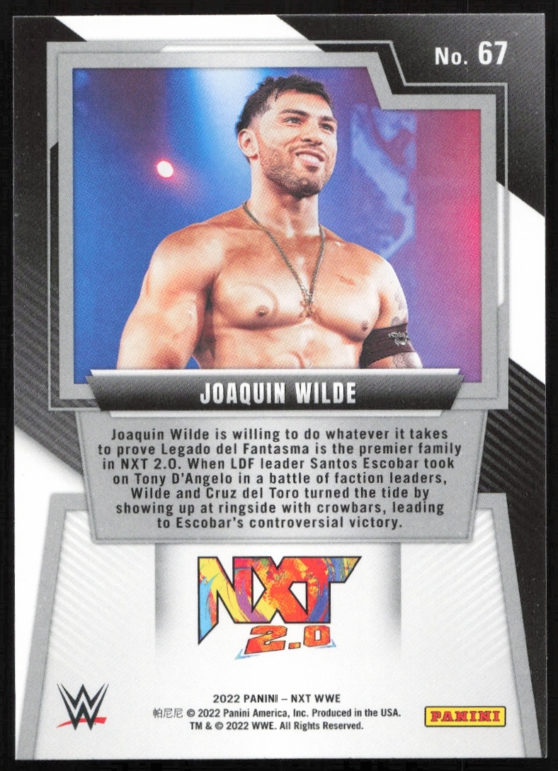 This Wrestling card, from 2022 is part of the Panini NXT 2.0 WWE card set. Joaquin Wilde is featured and has a card number of 67.