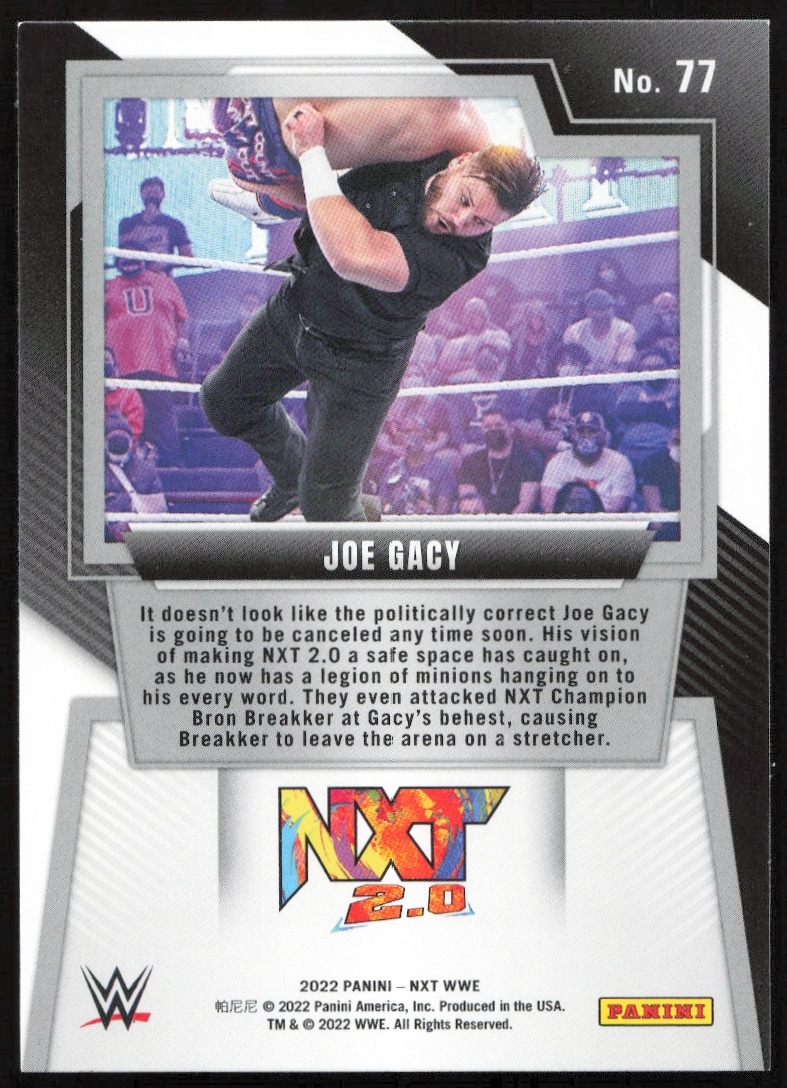 This Wrestling card, from 2022 is part of the Panini NXT 2.0 WWE card set. Joe Gacy is featured and has a card number of 77.