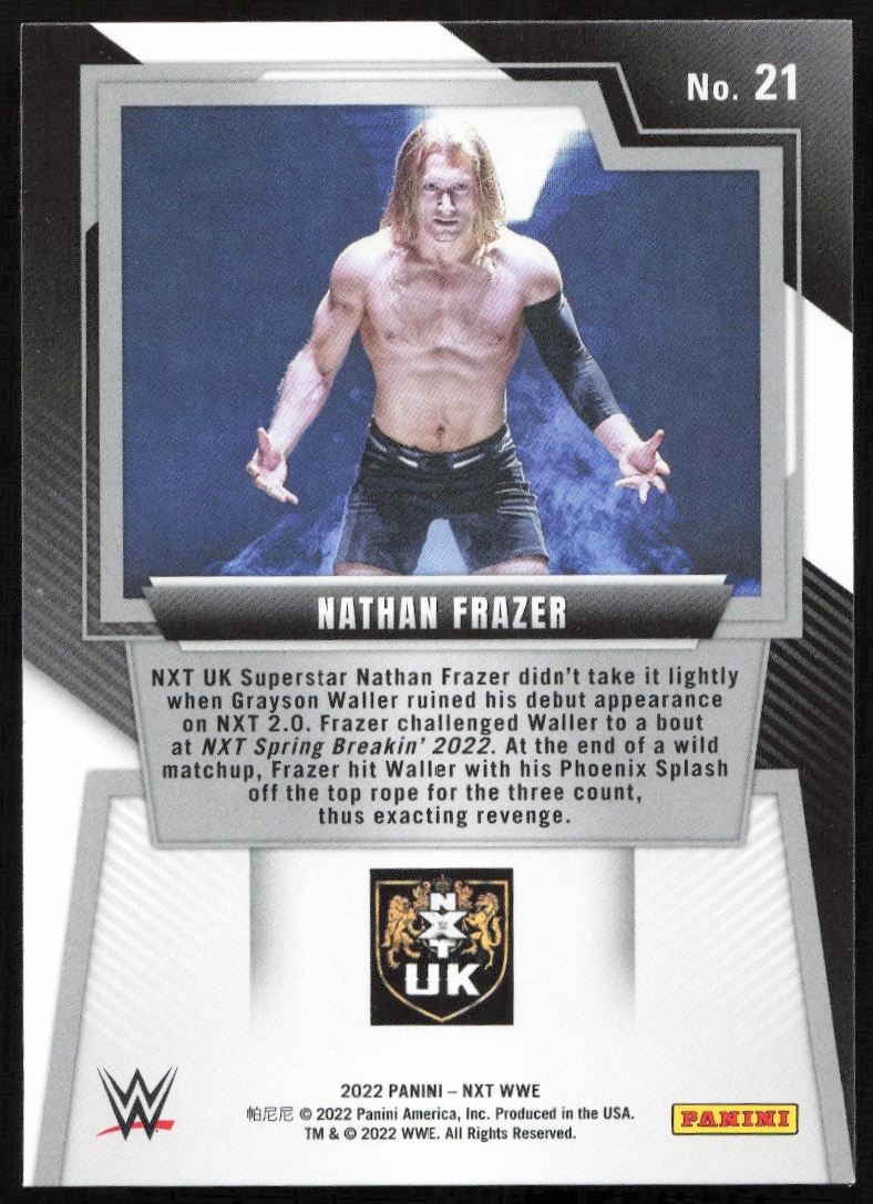 This Wrestling card, from 2022 is part of the Panini NXT 2.0 WWE card set. Nathan Frazer is featured and has a card number of 21.