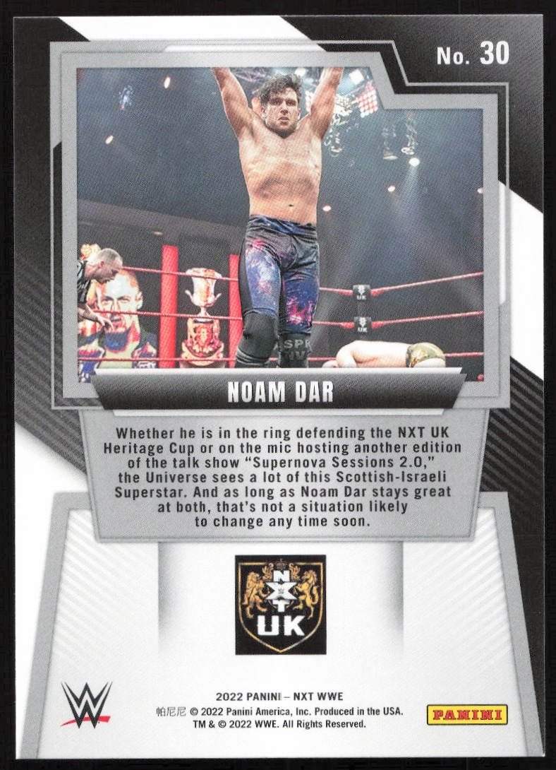 This Wrestling card, from 2022 is part of the Panini NXT 2.0 WWE card set. Noam Dar is featured and has a card number of 30.