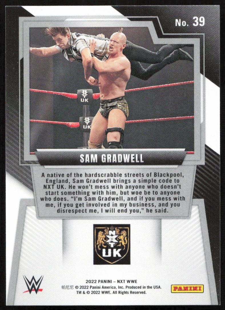 This Wrestling card, from 2022 is part of the Panini NXT 2.0 WWE card set. Sam Gradwell is featured and has a card number of 39.