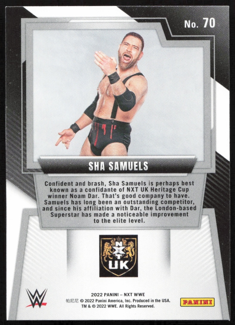 This Wrestling card, from 2022 is part of the Panini NXT 2.0 WWE card set. Sha Samuels is featured and has a card number of 70.