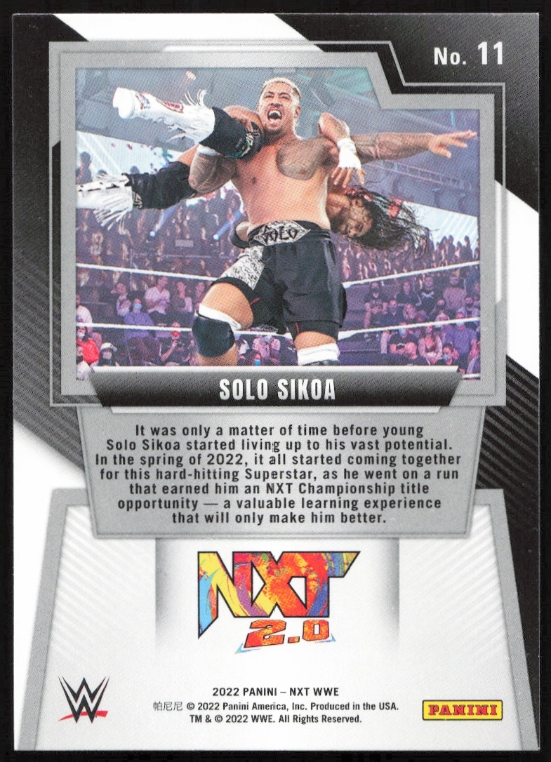 This Wrestling card, from 2022 is part of the Panini NXT 2.0 WWE card set. Solo Sikoa is featured and has a card number of 11.