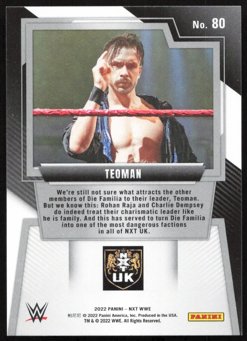 This Wrestling card, from 2022 is part of the Panini NXT 2.0 WWE card set. Teoman is featured and has a card number of 80.