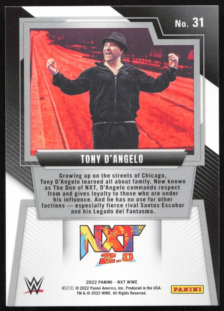 This Wrestling card, from 2022 is part of the Panini NXT 2.0 WWE card set. Tony D’Angelo is featured and has a card number of 31.