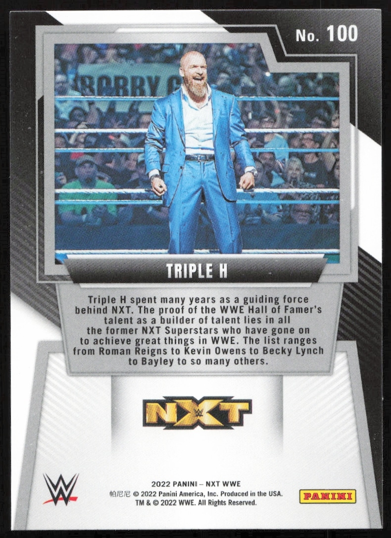 This Wrestling card, from 2022 is part of the Panini NXT 2.0 WWE card set. Triple H is featured and has a card number of 100.