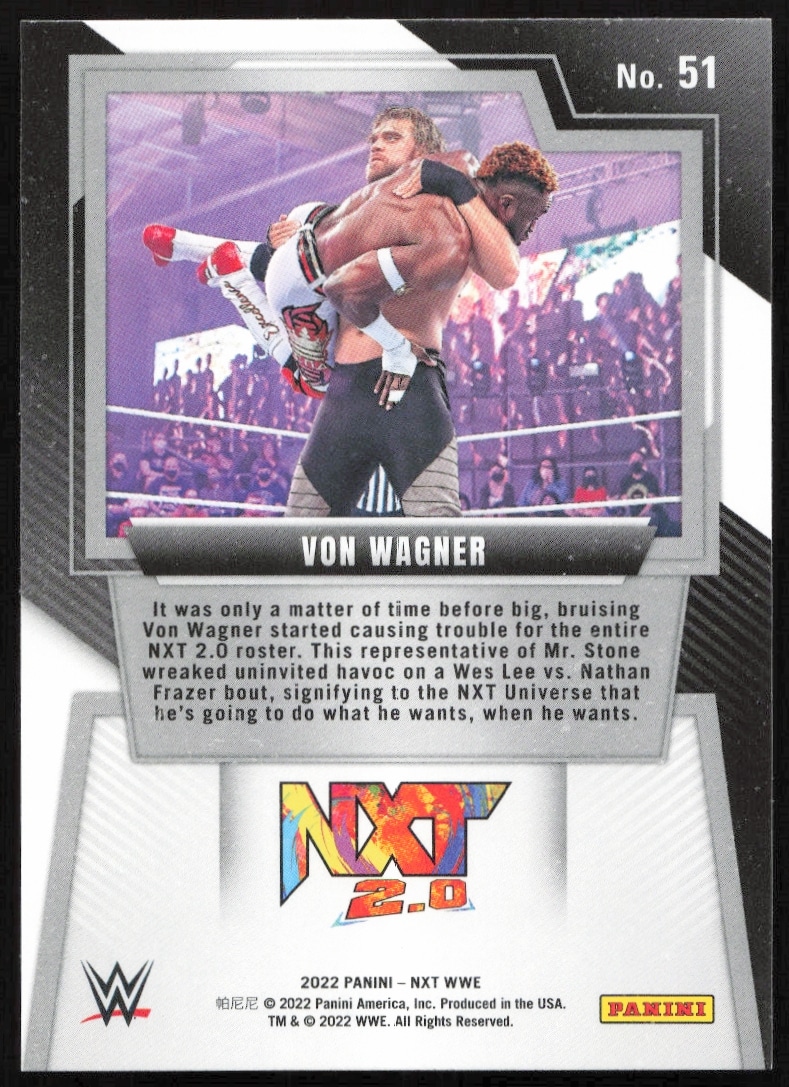 This WrestlingΒ card, from 2022 is part of the Panini NXT 2.0 WWEΒ card set. Von Wagner is featured and has a card number of 51.