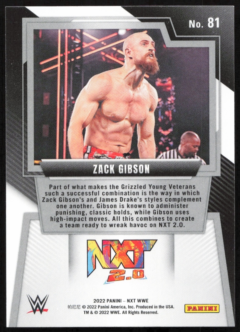 This Wrestling card, from 2022 is part of the Panini NXT 2.0 WWE card set. Zack Gibson is featured and has a card number of 81.