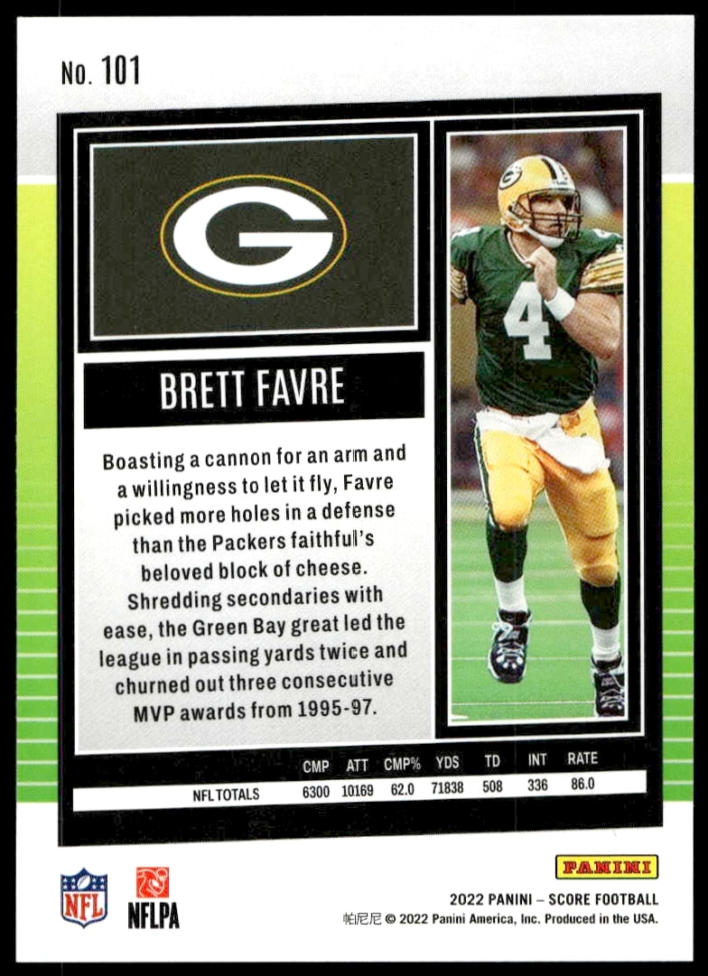 This Football card, from 2022 is part of the Panini Score card set. Brett Favre is featured and has a card number of 101.