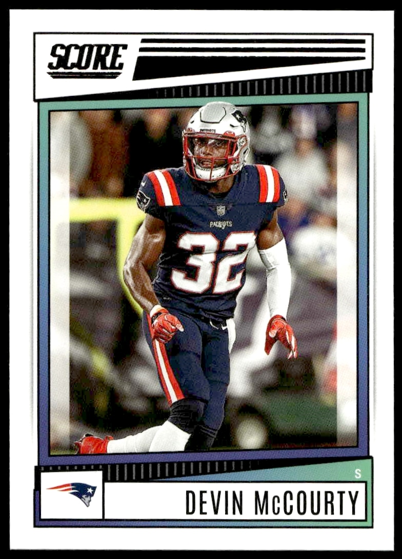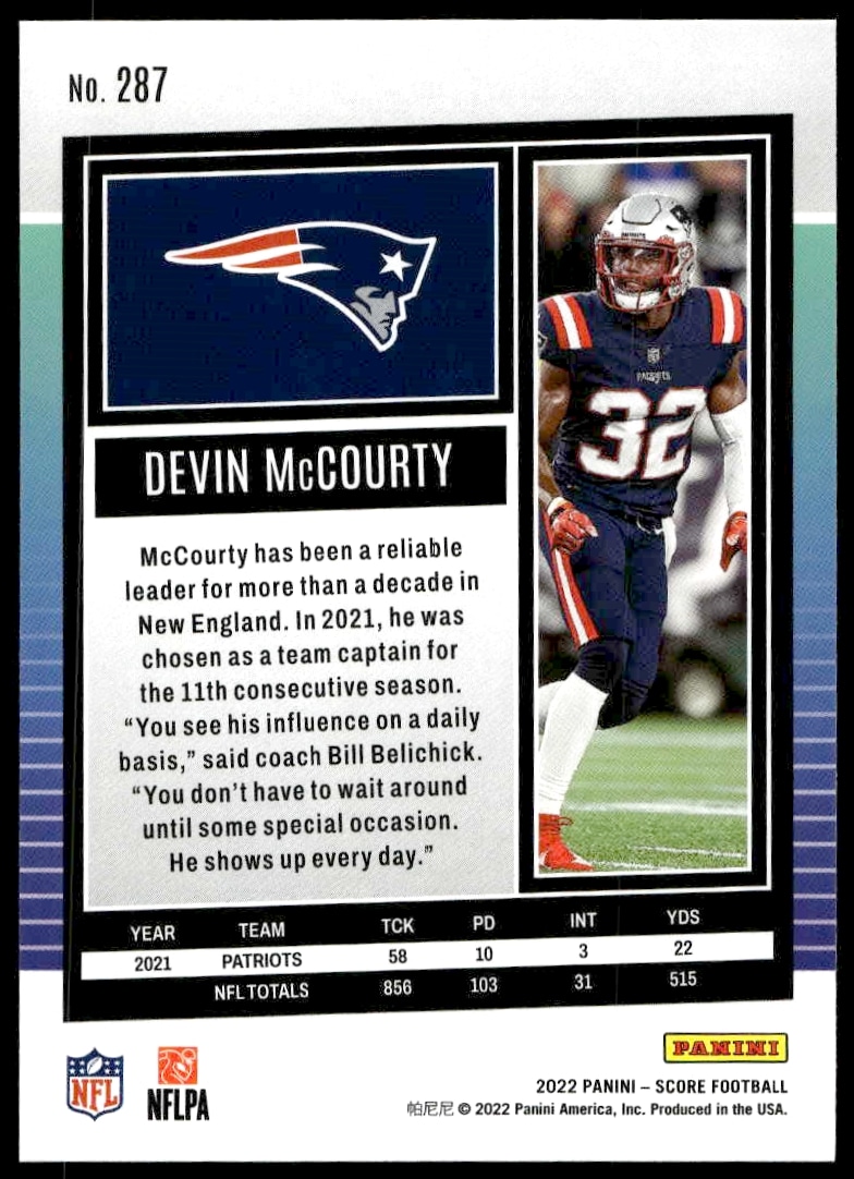 This Football card, from 2022 is part of the Panini Score card set. Devin McCourty is featured and has a card number of 287.