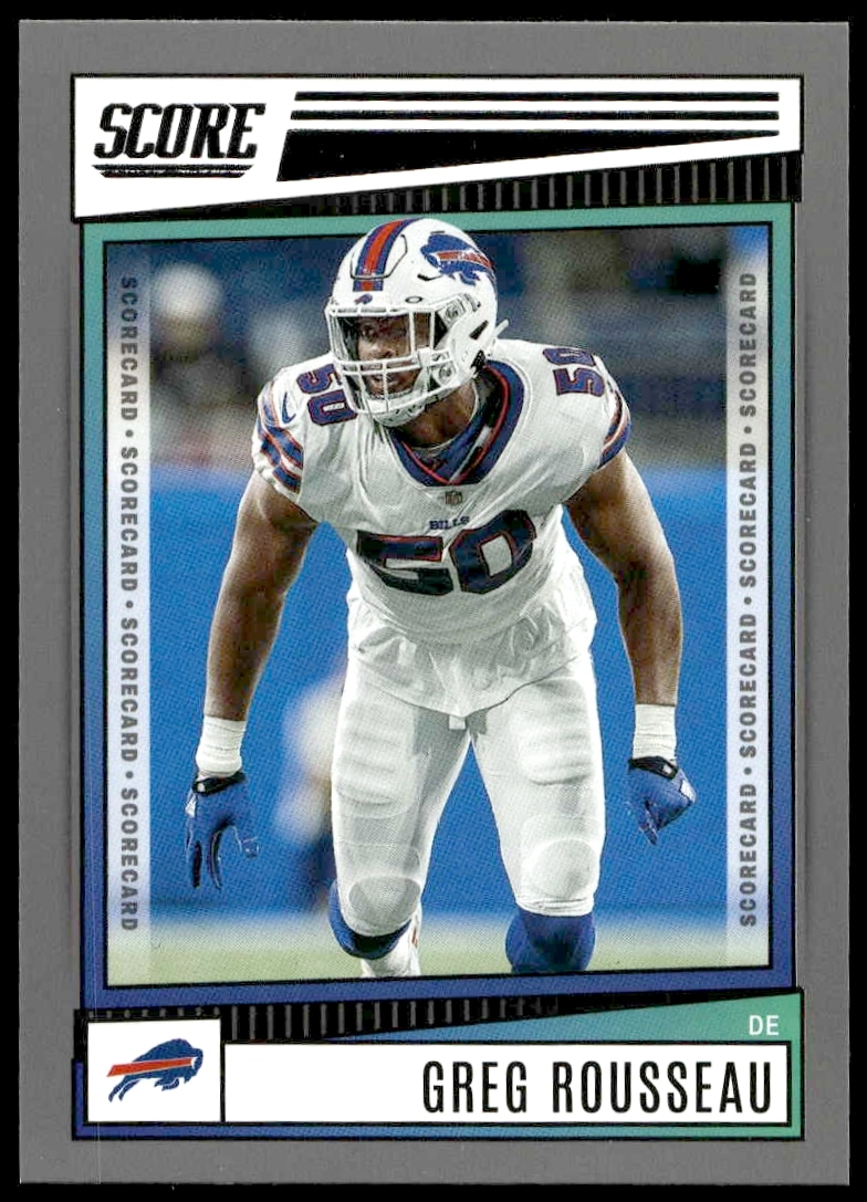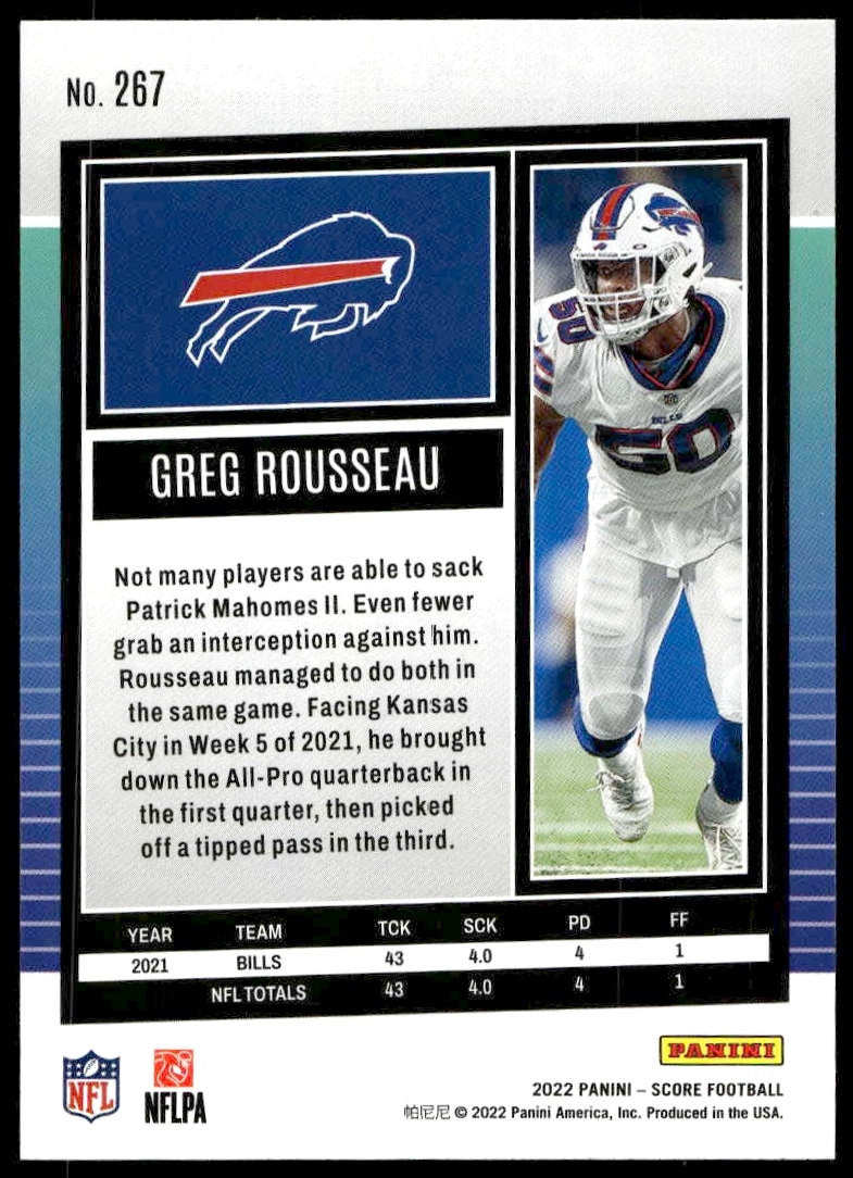 This Football card, from 2022 is part of the Panini Score card set. Greg Rousseau is featured and has a card number of 267.