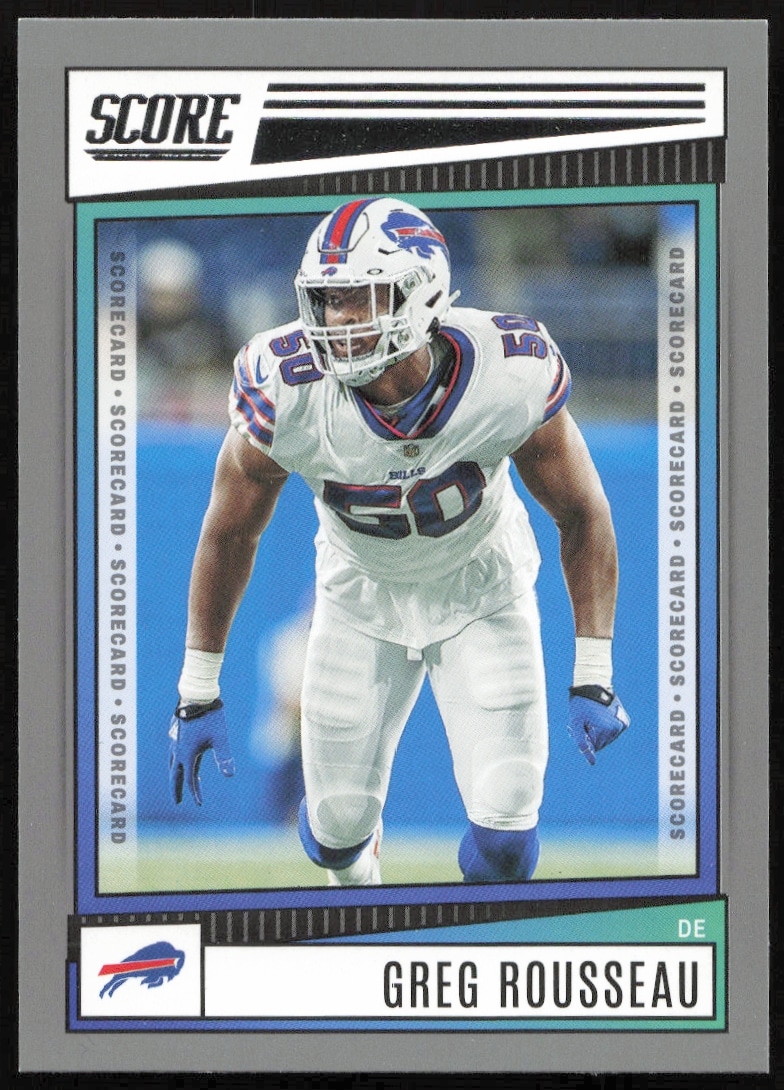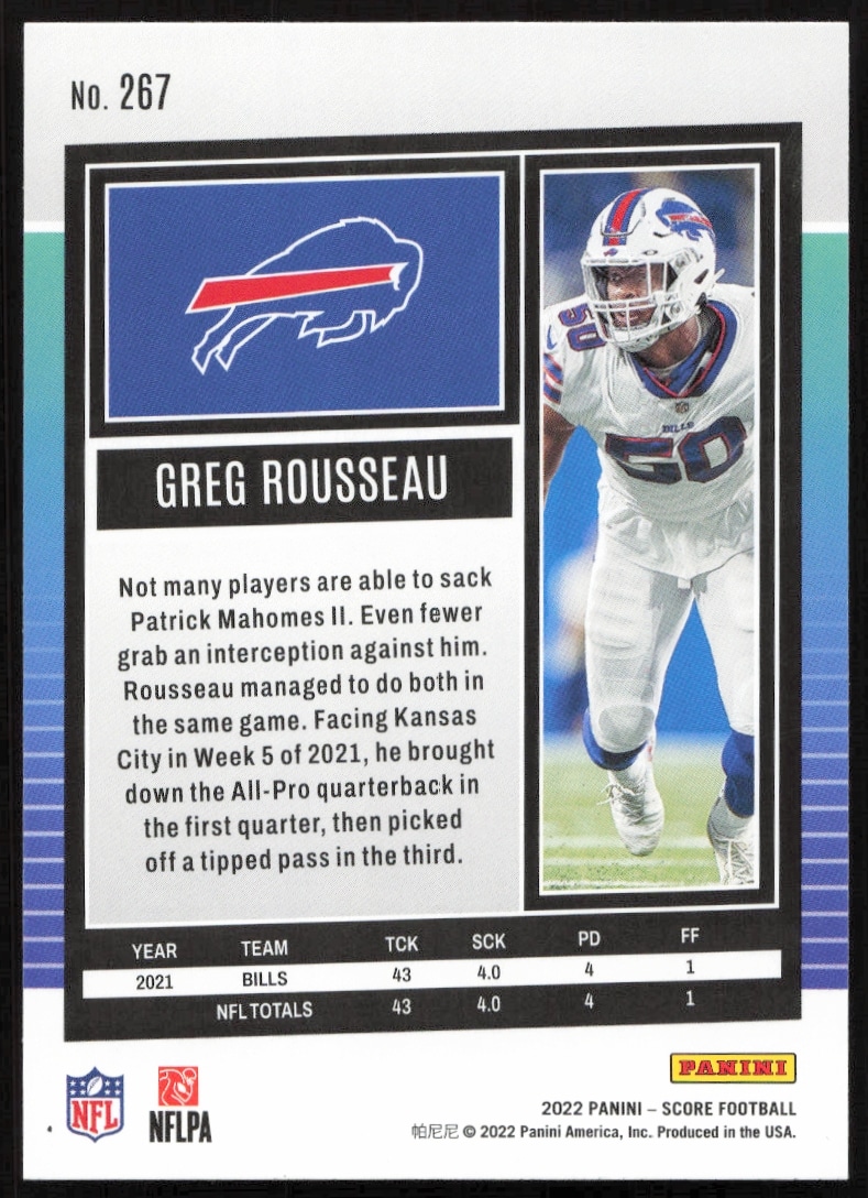 This Football card, from 2022 is part of the Panini Score card set. Greg Rousseau is featured and has a card number of 267.