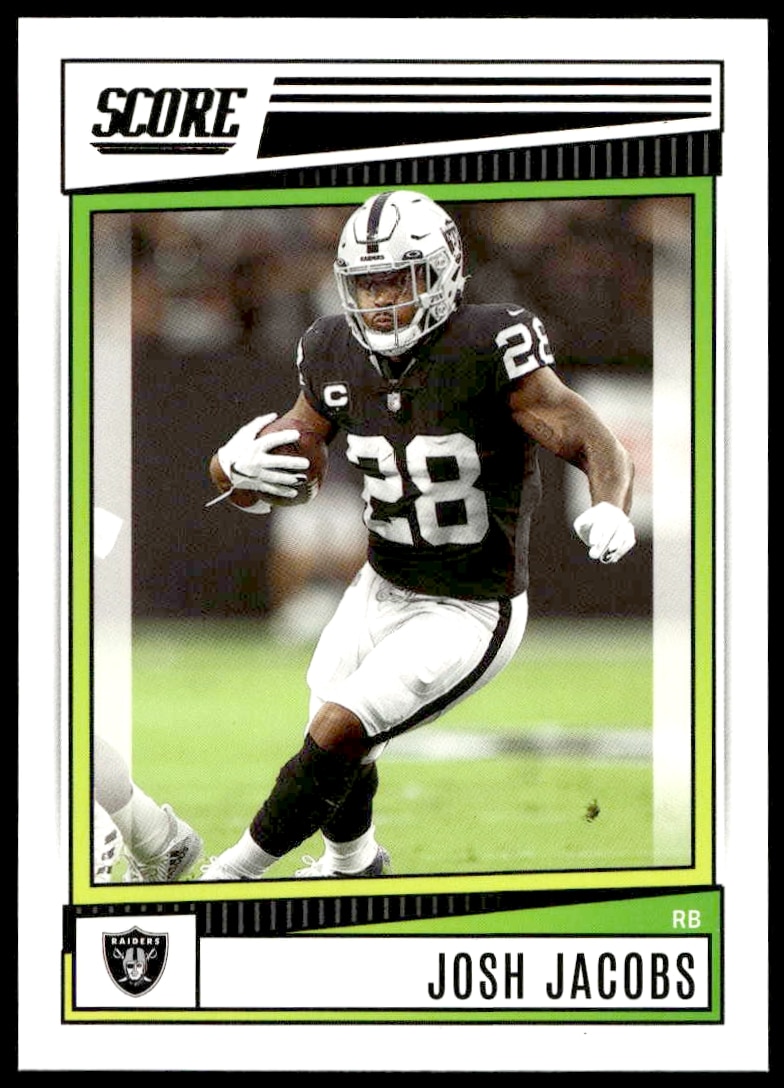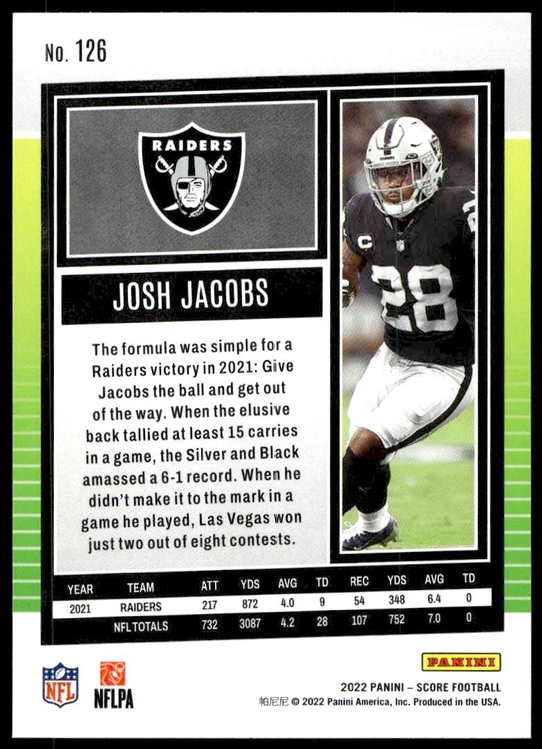 This Football card, from 2022 is part of the Panini Score card set. Josh Jacobs is featured and has a card number of 126.