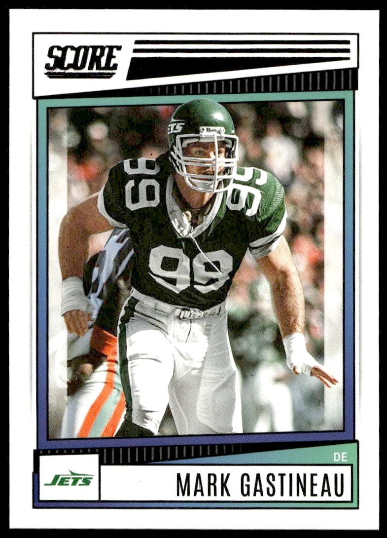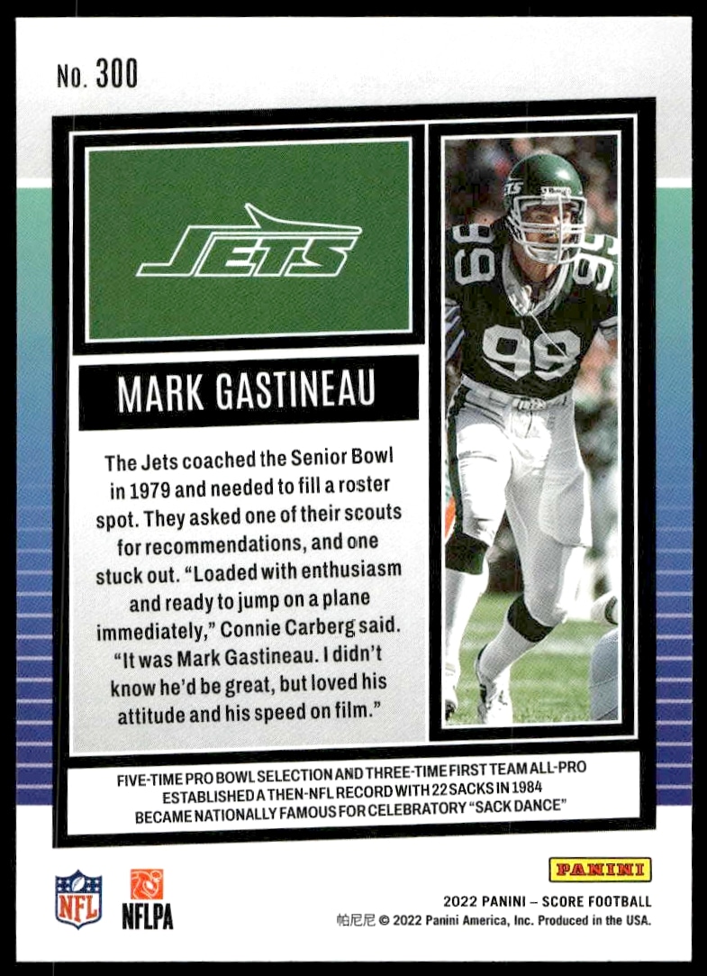 This Football card, from 2022 is part of the Panini Score card set. Mark Gastineau is featured and has a card number of 28.