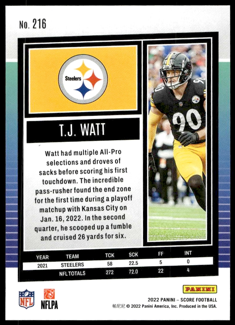 This Football card, from 2022 is part of the Panini Score card set. T.J. Watt is featured and has a card number of 216.