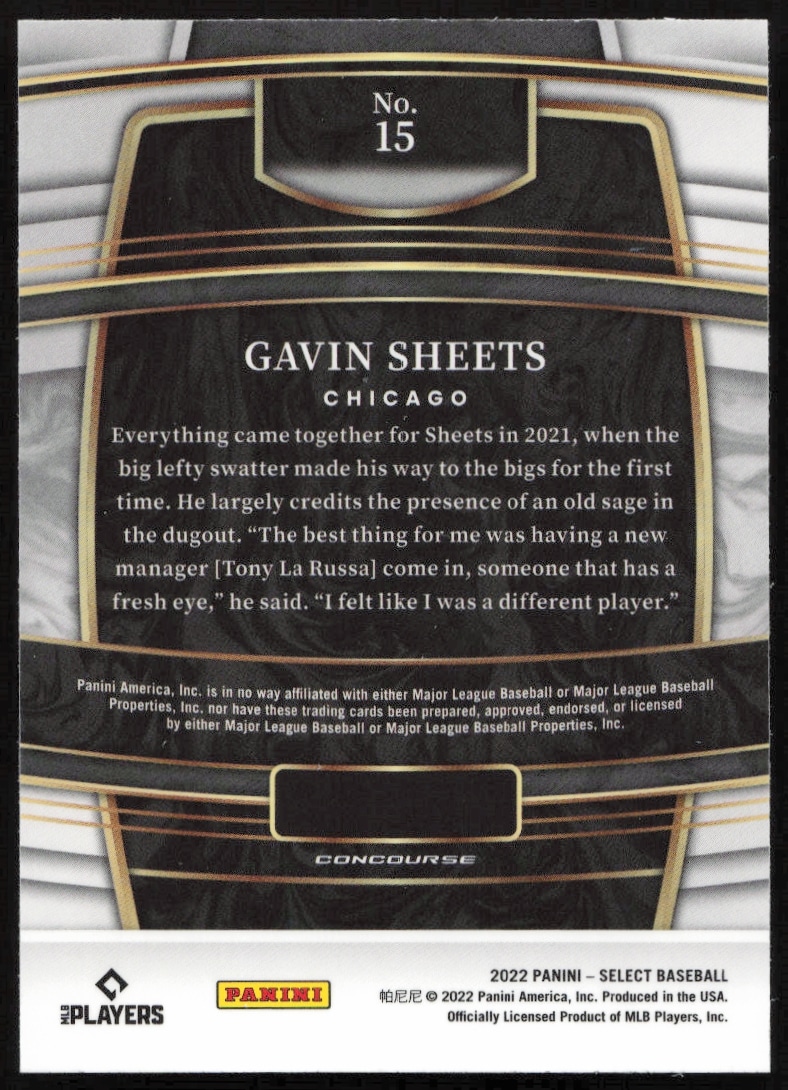 This Baseball card, from 2022 is part of the Panini Select card set. Gavin Sheets is featured and has a card number of 15.