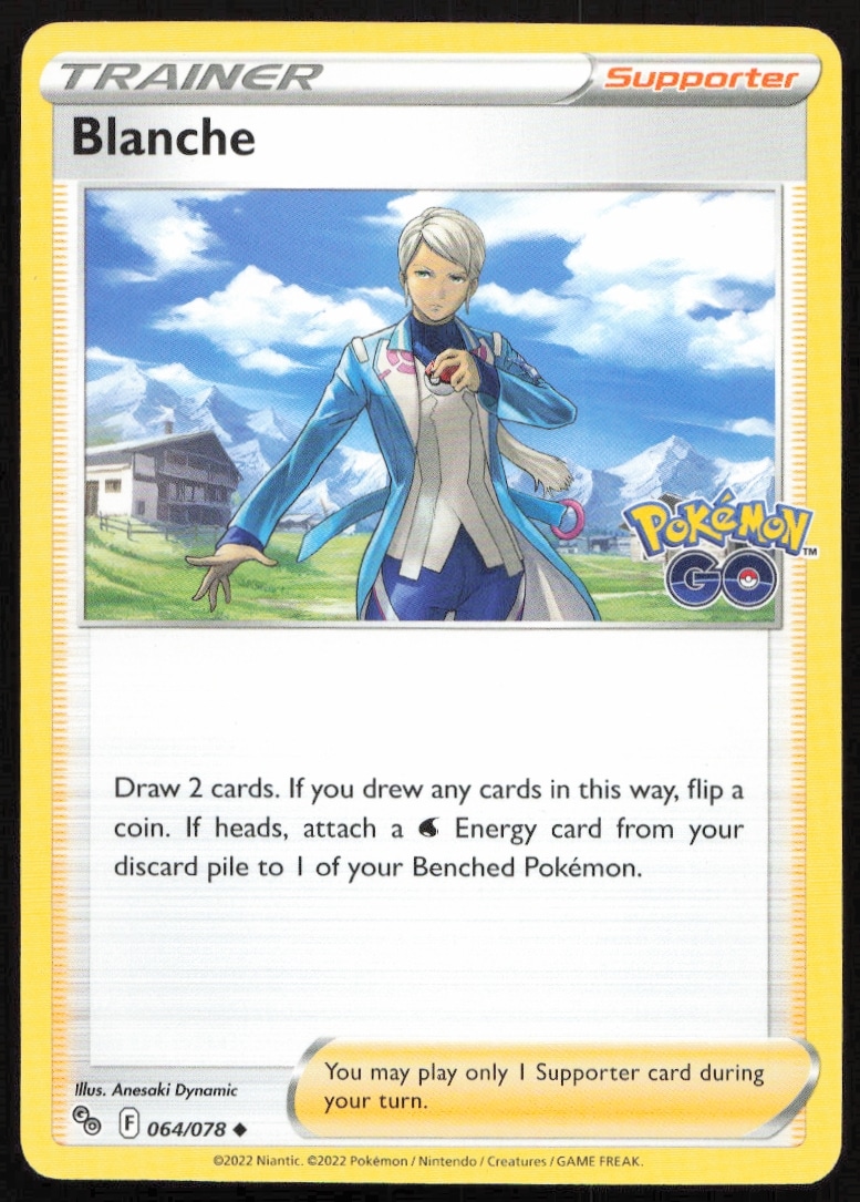 This Pokémon card, from 2022 is part of the Pokémon GO card set. Blanche is featured and has a card number of 064/078.