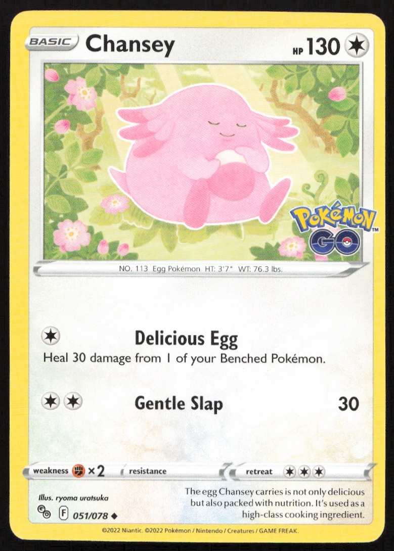 This Pokémon card, from 2022 is part of the Pokémon GO card set. Chansey is featured and has a card number of 051/078.
