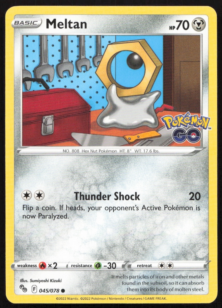 This Pokémon card, from 2022 is part of the Pokémon GO card set. Meltan is featured and has a card number of 045/078.