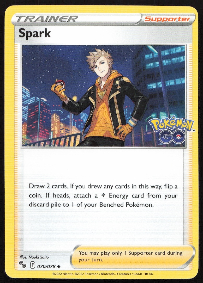 This Pokémon card, from 2022 is part of the Pokémon GO card set. Spark is featured and has a card number of 070/078.
