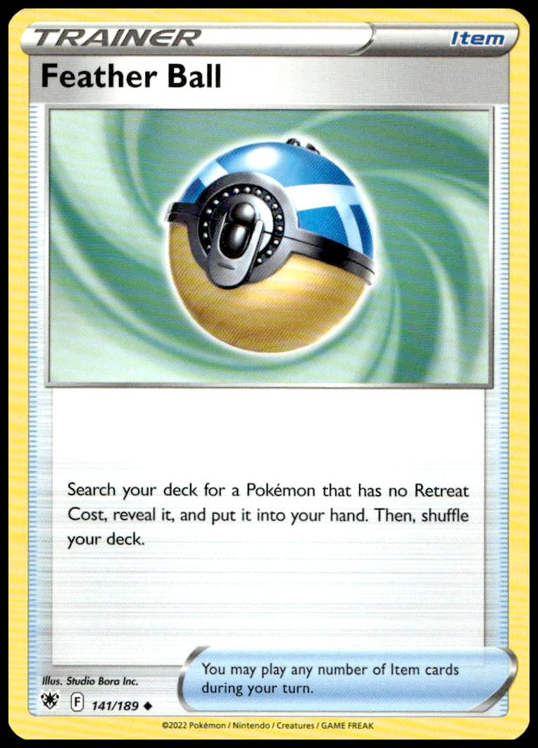 This Pokemon card, from 2022 is part of the Pokémon Sword & Shield – Astral Radiance card set. Feather Ball is featured and has a card number of 141/189.