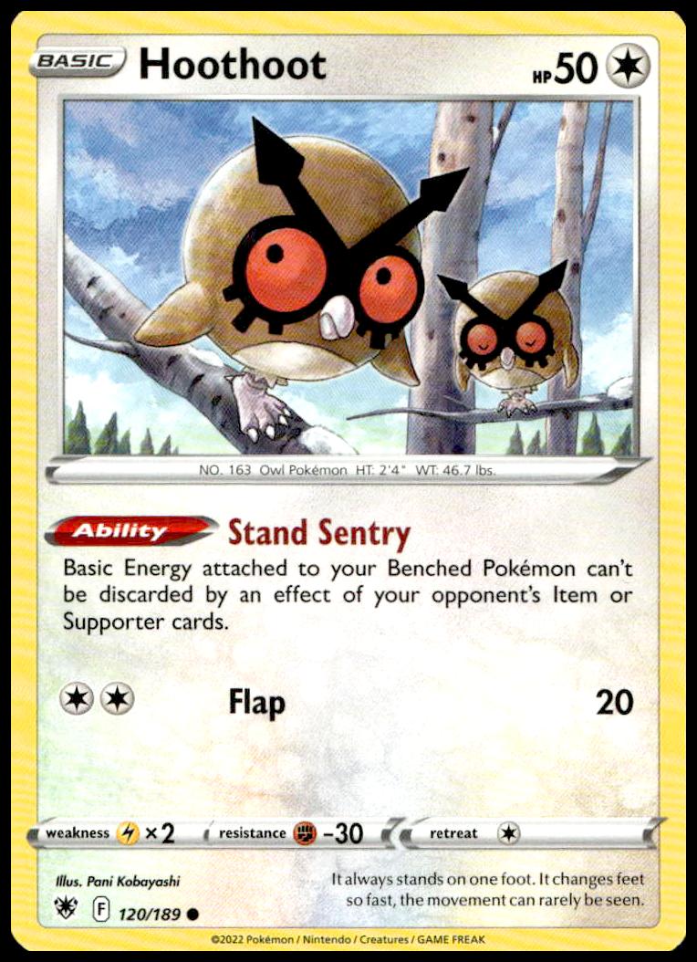 This Pokemon card, from 2022 is part of the Pokémon Sword & Shield – Astral Radiance card set. Hoothoot is featured and has a card number of 120/189.