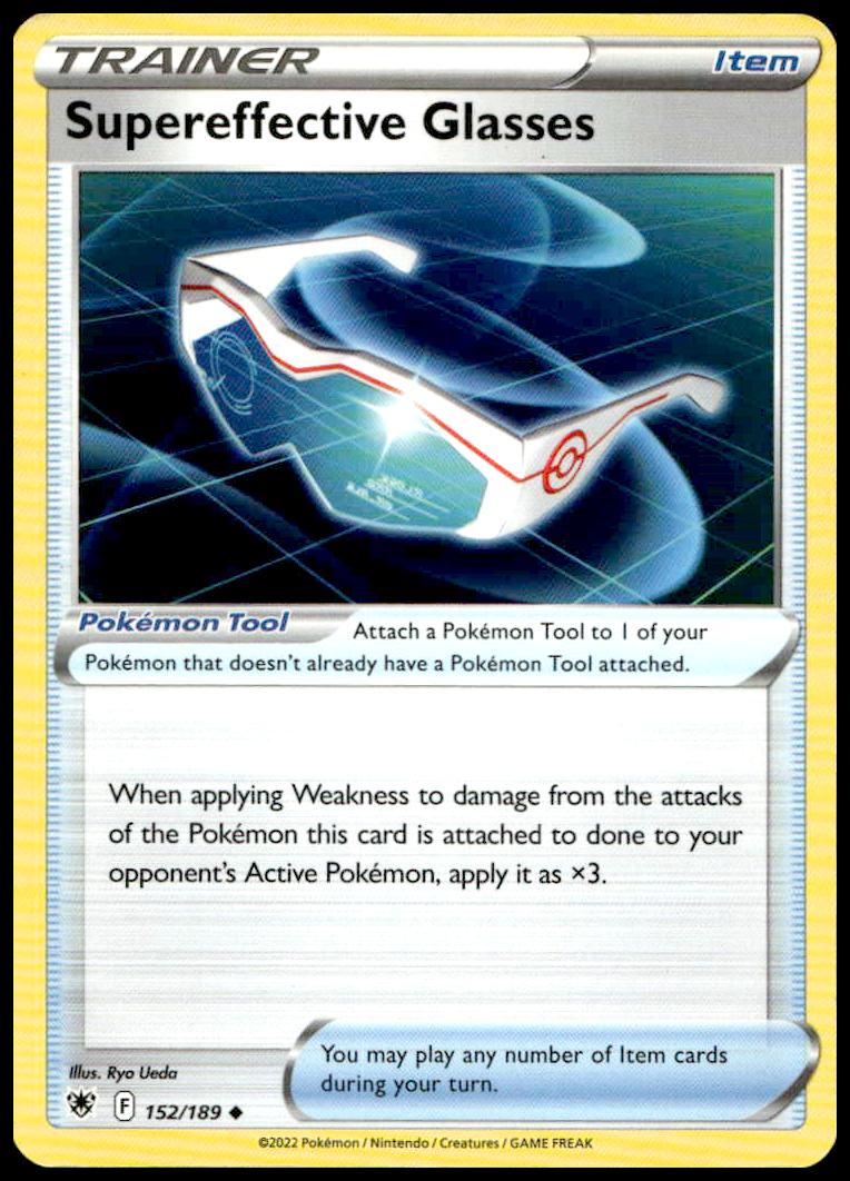 This Pokemon card, from 2022 is part of the Pokémon Sword & Shield – Astral Radiance card set. Supereffective Glasses is featured and has a card number of 152/189.