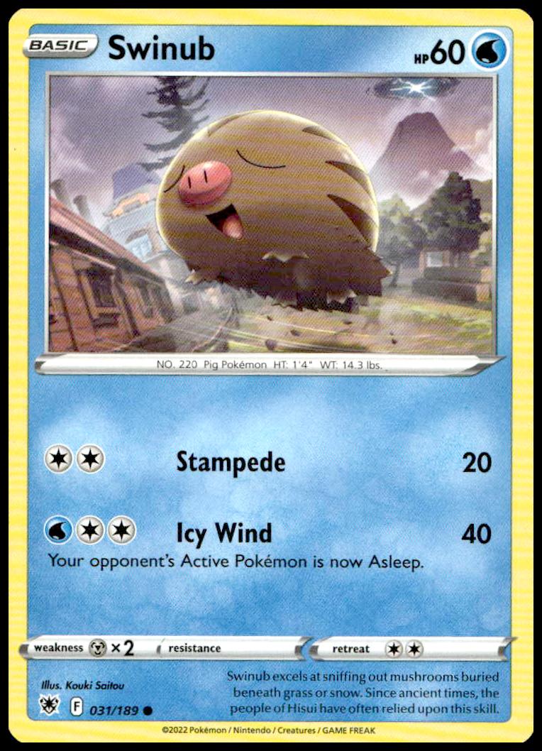 This Pokemon card, from 2022 is part of the Pokémon Sword & Shield – Astral Radiance card set. Swinub is featured and has a card number of 031/189.