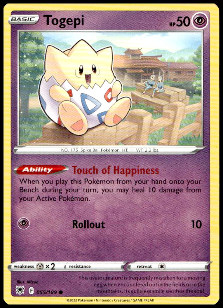 This Pokemon card, from 2022 is part of the Pokémon Sword & Shield – Astral Radiance card set. Togepi is featured and has a card number of 055/189.