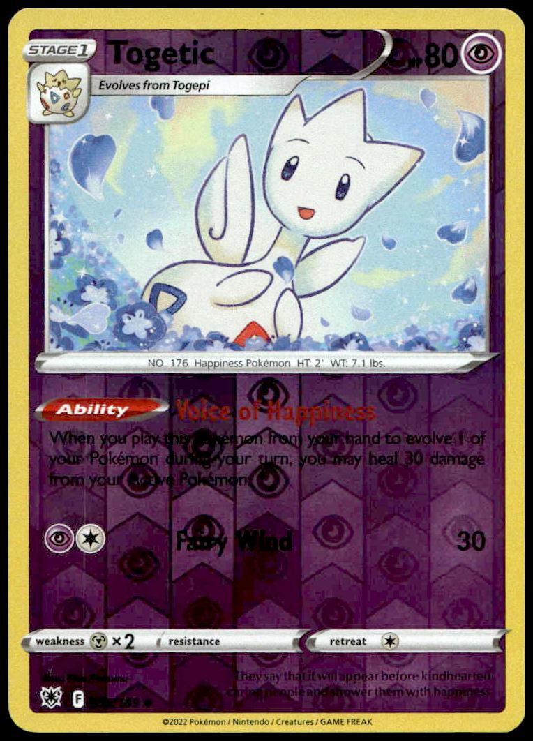 This Pokemon card, from 2022 is part of the Pokémon Sword & Shield – Astral Radiance card set. Togetic is featured and has a card number of 056/189.