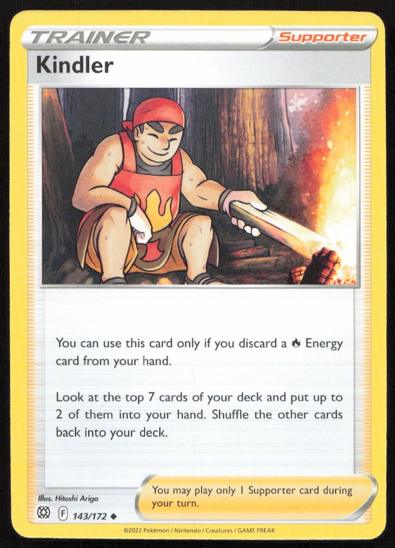 This Pokémon card, from 2022 is part of the Pokémon Sword & Shield – Brilliant Stars card set. Kindler is featured and has a card number of 143/172.